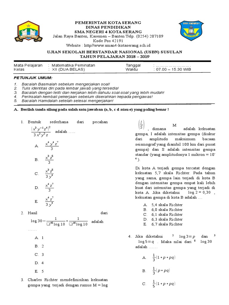 Matematika Di Sma Soal Soal Usbn Matematika Peminatan from 1.bp.blogspot.com Soal pat matematika peminatan kelas 11 dan jawabannya. Demikianlah pembahasan mengenai tentang soal matematika kelas 10. Ujian berlangsung pada tanggal 21 juli 2019. Savesave pembahasan usbn 2019 matematika wajib (anchor) www. Soal dan pembahasan ujian nasional matematika jurusan. Jadi untuk soal usbn matematika yang terdiri dari 35 butir soal meliputi 30 soal pilihan ganda dan 5 soal uraian, terdapat 9 butir soal yang merupakan soal anchor. Lihat semua pos dari msyaifuly. Boleh jadi soal ada kemiripan atau bahkan tidak sama sekali.